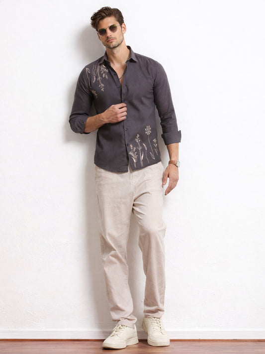 Men’s Linen Light Grey Slim-Fit Casual Trousers– Black Thread