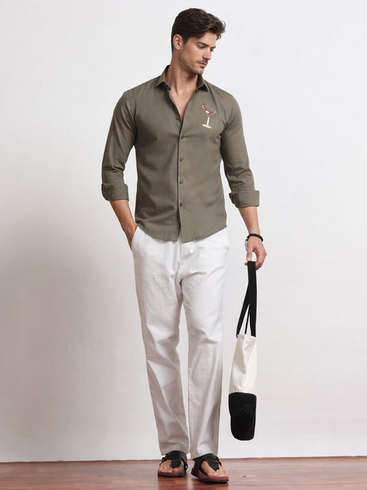 Men's Linen Olive Green Cocktail Glass Embroidery