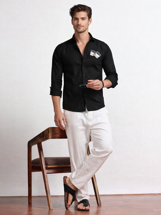 Men’s Linen Jet Black Slim-Fit Casual Trousers– Black Thread