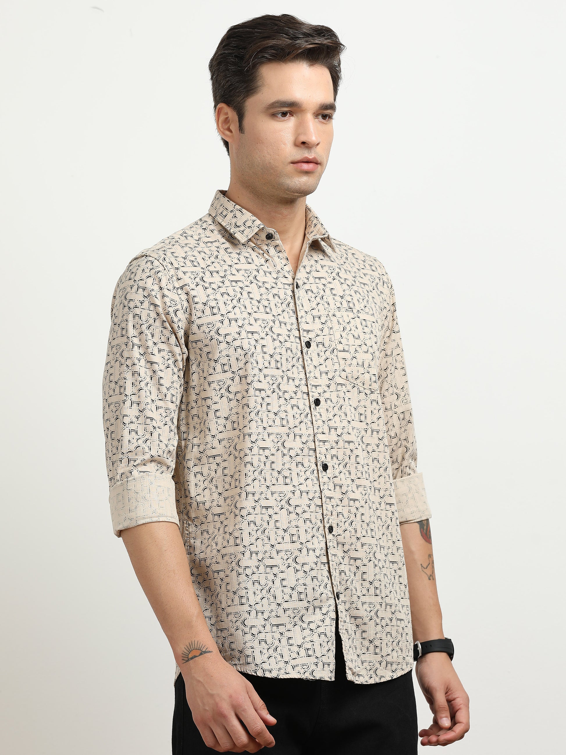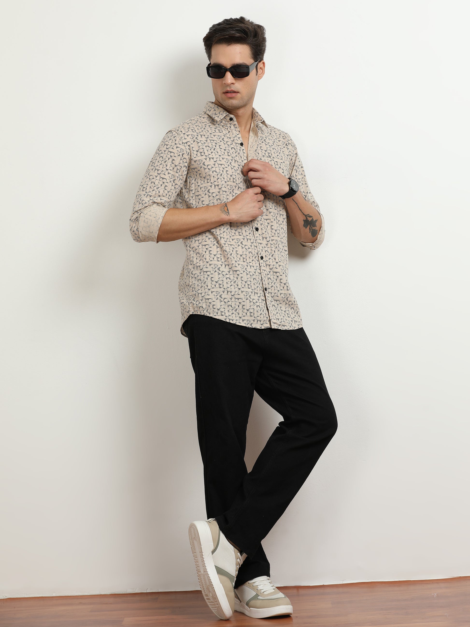 Chic and comfortable, this Men’s Beige Printed Cotton Shirt by Black Thread is a stylish essential for your everyday wardrobe. Crafted from premium breathable cotton, it ensures lightweight comfort while keeping your look sharp. The neutral beige base is enhanced with an abstract black all-over print, adding a modern yet understated edge. With slim-fit tailoring, a button-down front, and full sleeves, this shirt works perfectly for office wear, casual outings, or evening events.