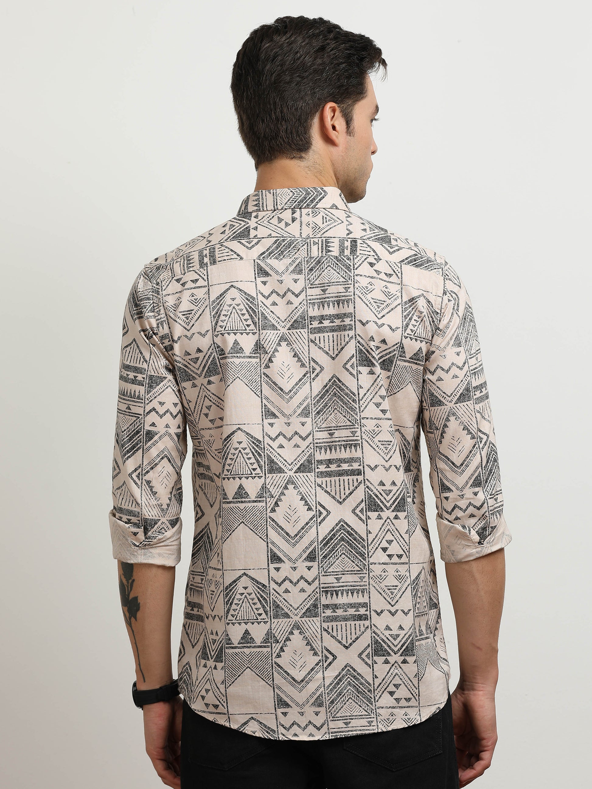 Stand out with this Men’s Beige Geometric Printed Cotton Shirt by Black Thread, designed for bold and modern styling. Made from premium breathable cotton, it delivers all-day comfort while keeping your look fashion-forward. The beige base is covered with striking black geometric patterns, creating a unique, artistic vibe. Featuring slim-fit tailoring, a chest pocket, and button-down front, this shirt is a perfect choice for parties, casual evenings, or weekend outings where you want to make an impression.
