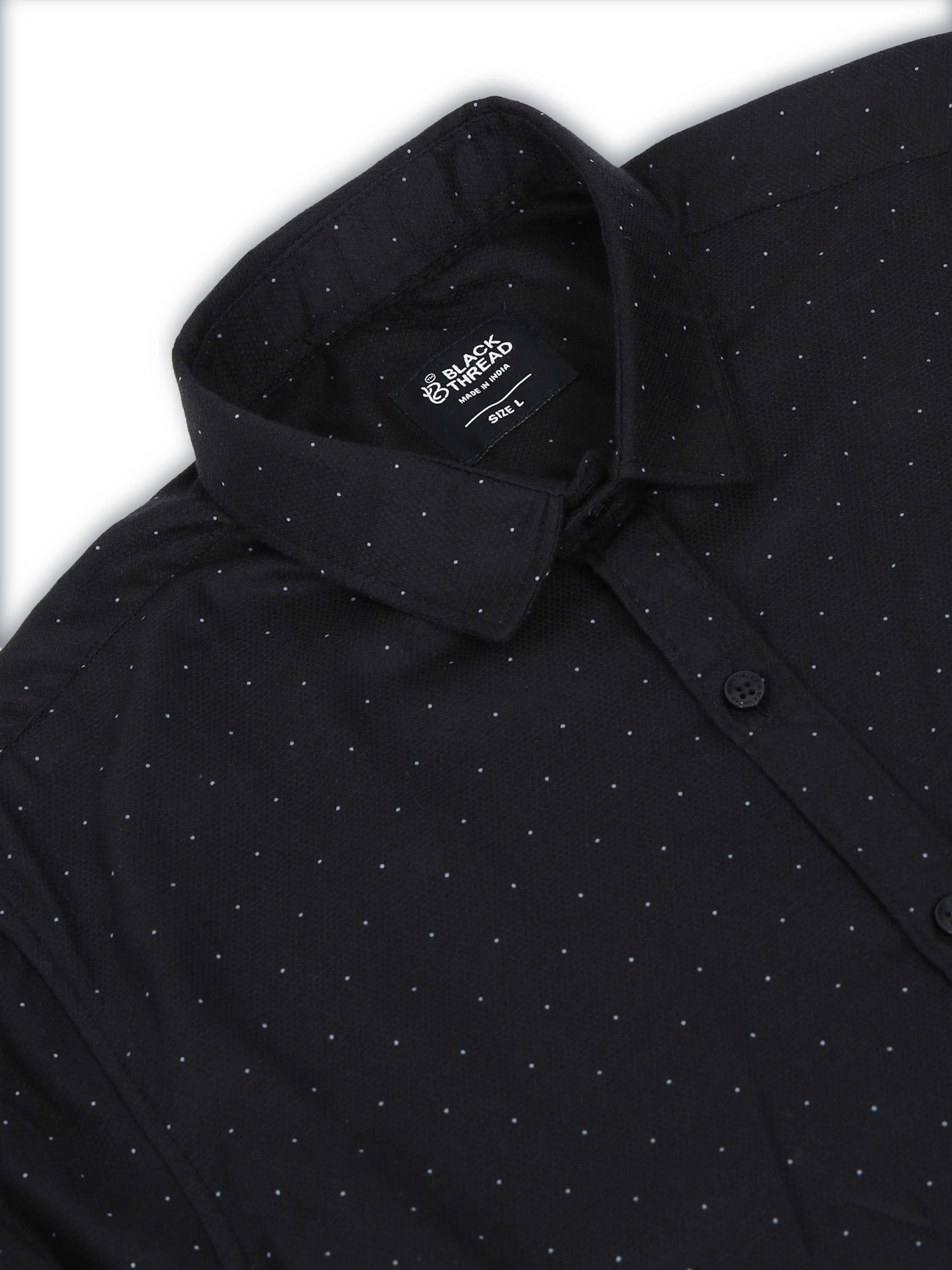 Timeless and versatile, this Men’s Black Dotted Cotton Shirt by Black Thread is the perfect blend of simplicity and modern style. Crafted from soft, breathable cotton, it ensures comfort without compromising on a sharp look. The solid black base is subtly enhanced with fine dotted detailing, adding a refined touch that makes it suitable for both casual and semi-formal occasions. With slim-fit tailoring, a button-down front, and full sleeves, this shirt pairs effortlessly with denim, chinos, or trousers.