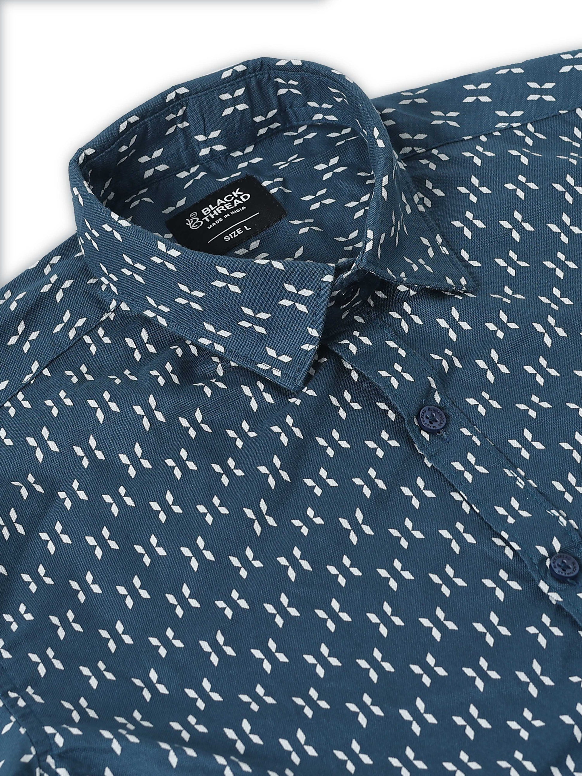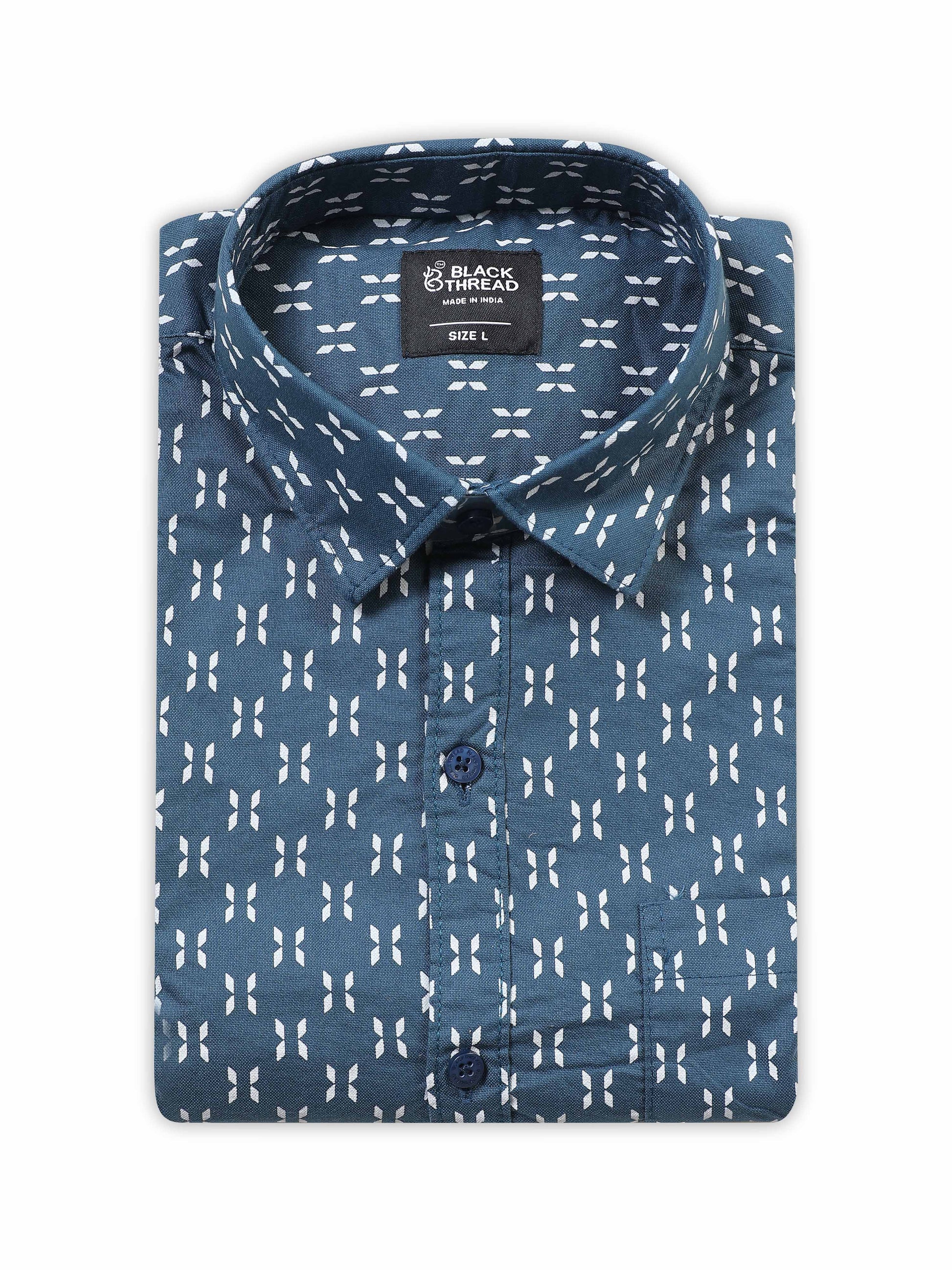 Smart and stylish, this Men’s Blue Printed Cotton Shirt by Black Thread adds a modern edge to your wardrobe. Made from soft and breathable cotton, it ensures comfort through the day while keeping your look sharp. The rich blue base is highlighted with a subtle white geometric print, giving it a versatile appeal that works for both casual and semi-formal settings. With slim-fit tailoring, button-down front, and contrast inner cuffs, this shirt pairs perfectly with chinos, denims, or trousers.