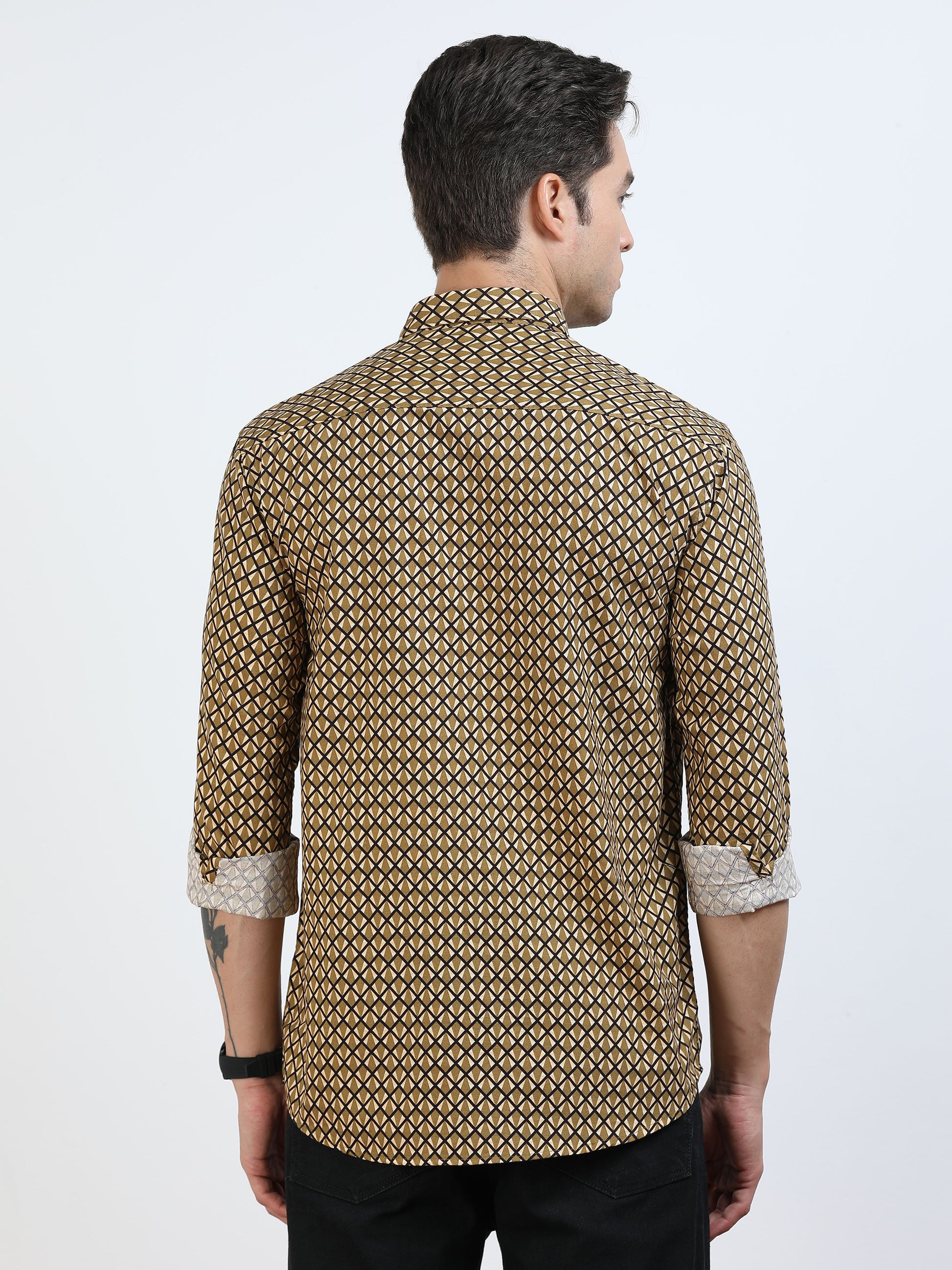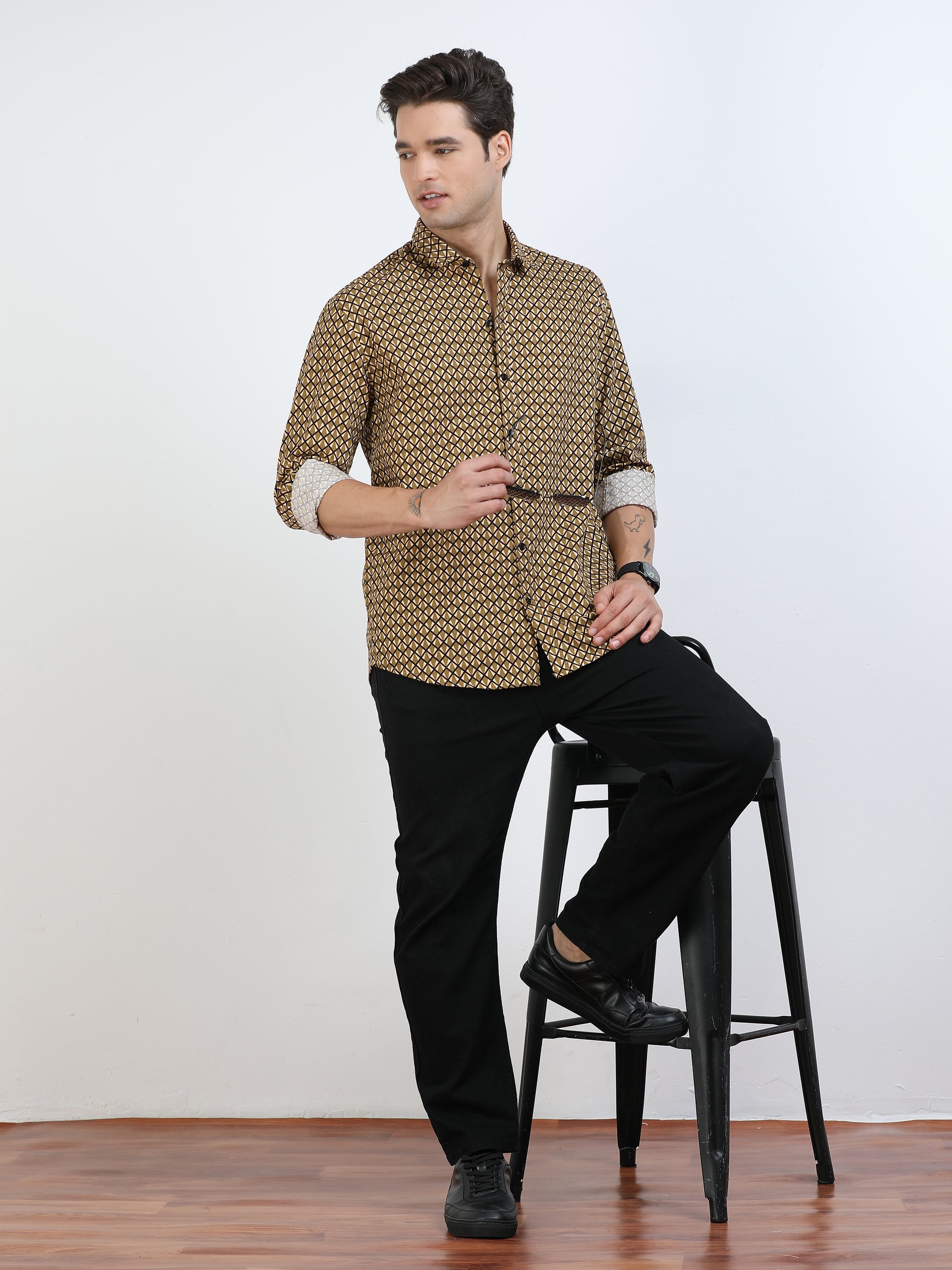 Refined and effortlessly stylish, this Men’s Mustard Printed Cotton Shirt by Black Thread is a versatile essential for the modern wardrobe. Crafted from premium breathable cotton, it combines comfort with an eye-catching geometric print that adds a bold yet sophisticated touch. Featuring a neat button-down design, slim-fit tailoring, and contrast inner cuffs for a smart roll-up look, this shirt transitions seamlessly from office hours to evening outings. Pair it with chinos, trousers, or denim for a look that’s both relaxed and elevated.