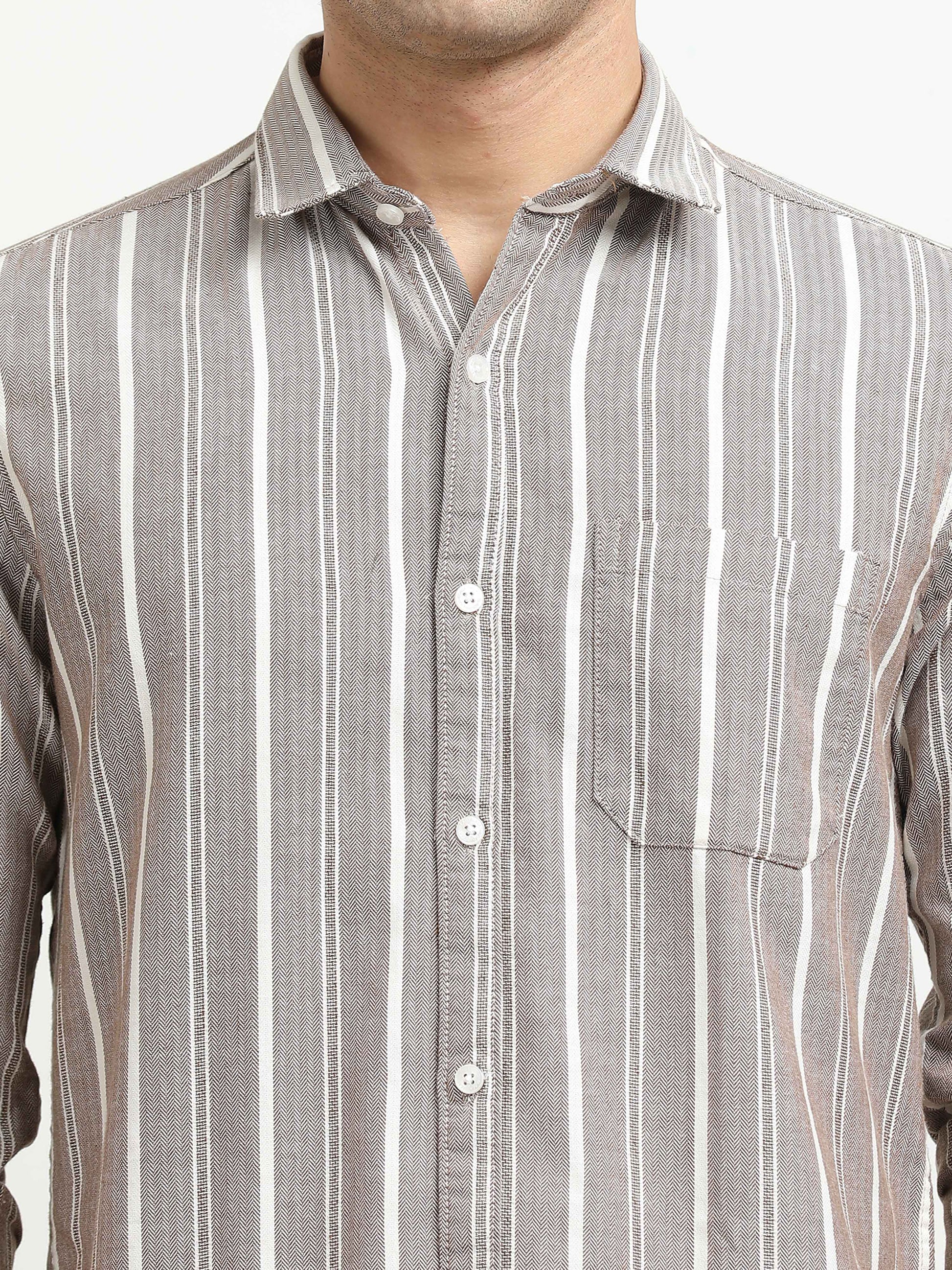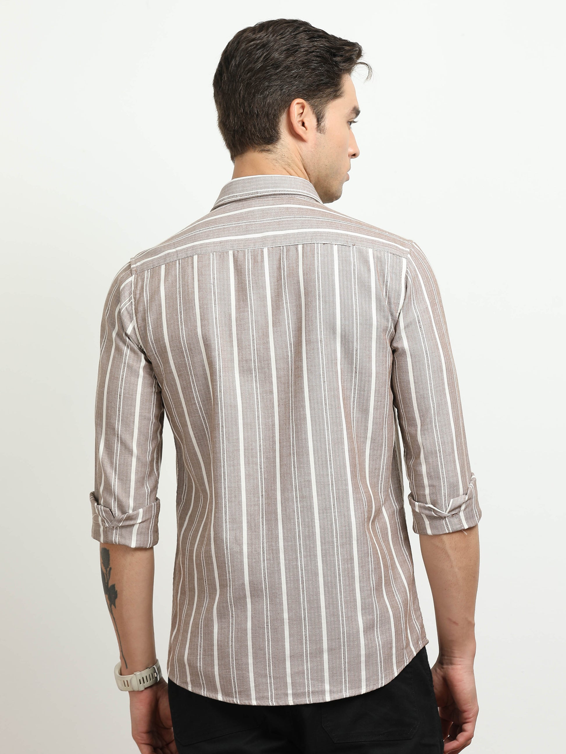 Clean and contemporary, this Men’s Brown & White Striped Cotton Shirt by Black Thread is the perfect blend of comfort and style. Made from breathable premium cotton, it ensures ease of wear while maintaining a sharp look. The earthy brown base paired with bold vertical white stripes creates a modern appeal that elongates the frame. Designed with slim-fit tailoring, a chest pocket, and a button-down front, this shirt works effortlessly for both smart-casual days and relaxed evenings.