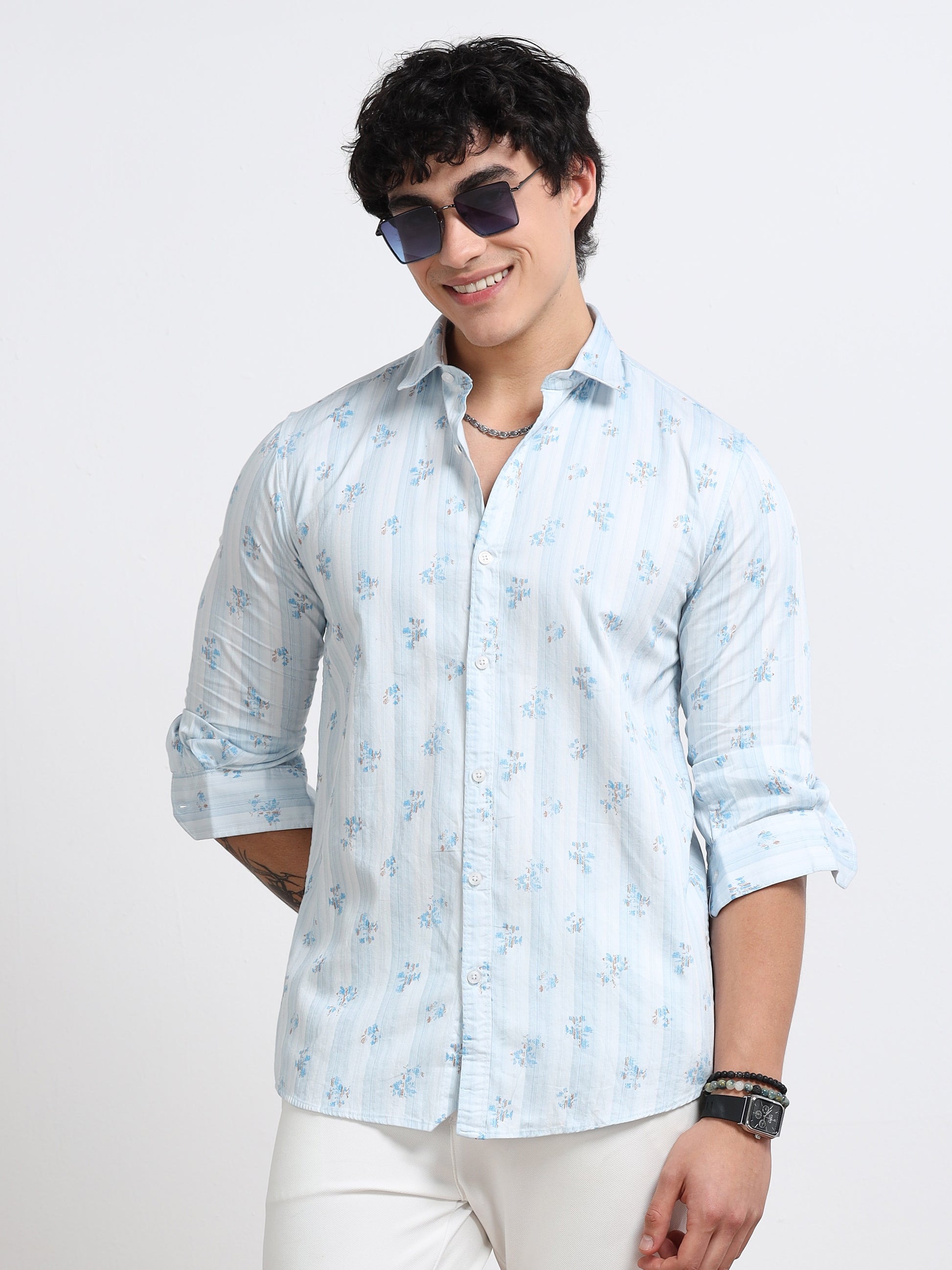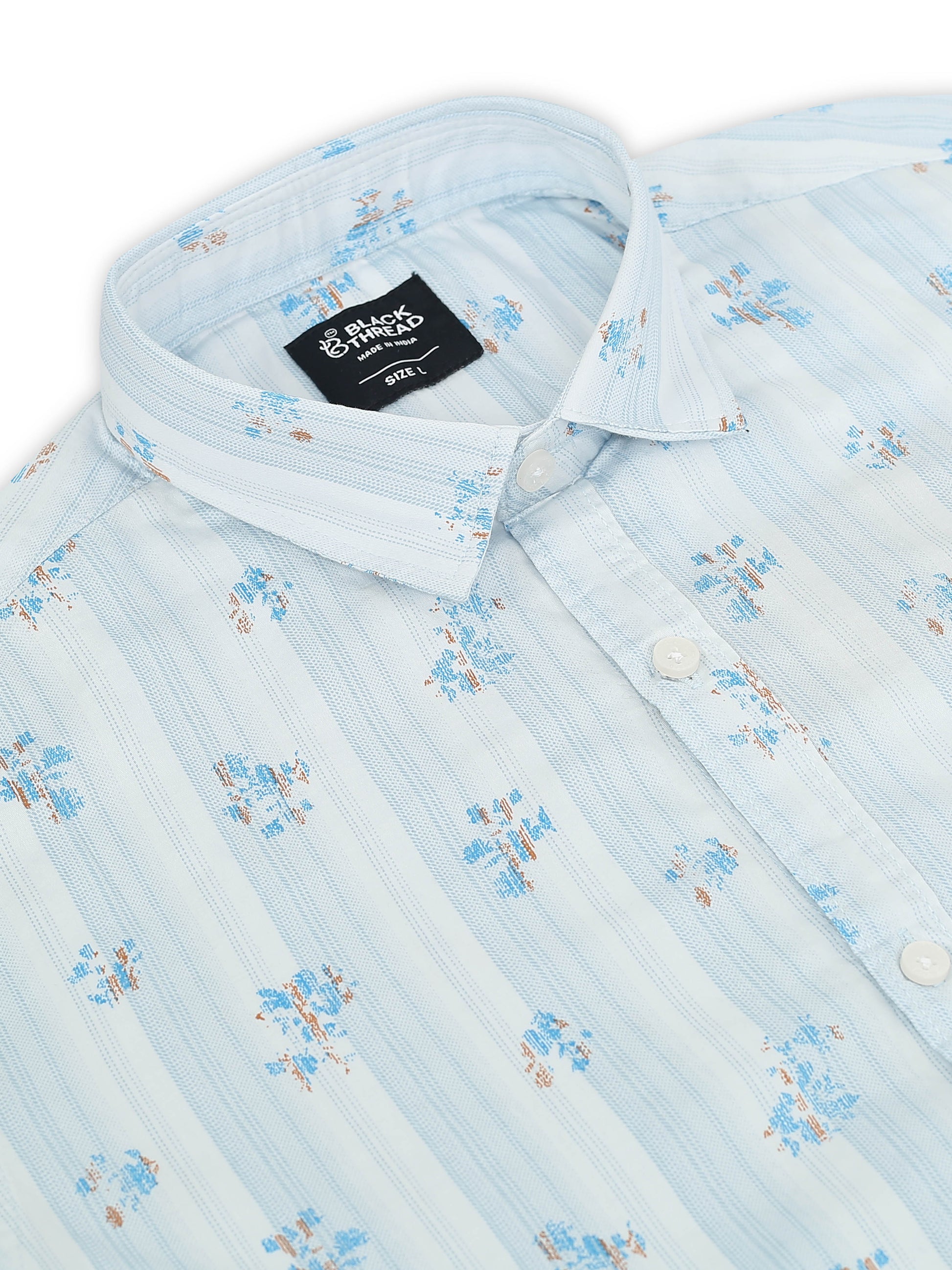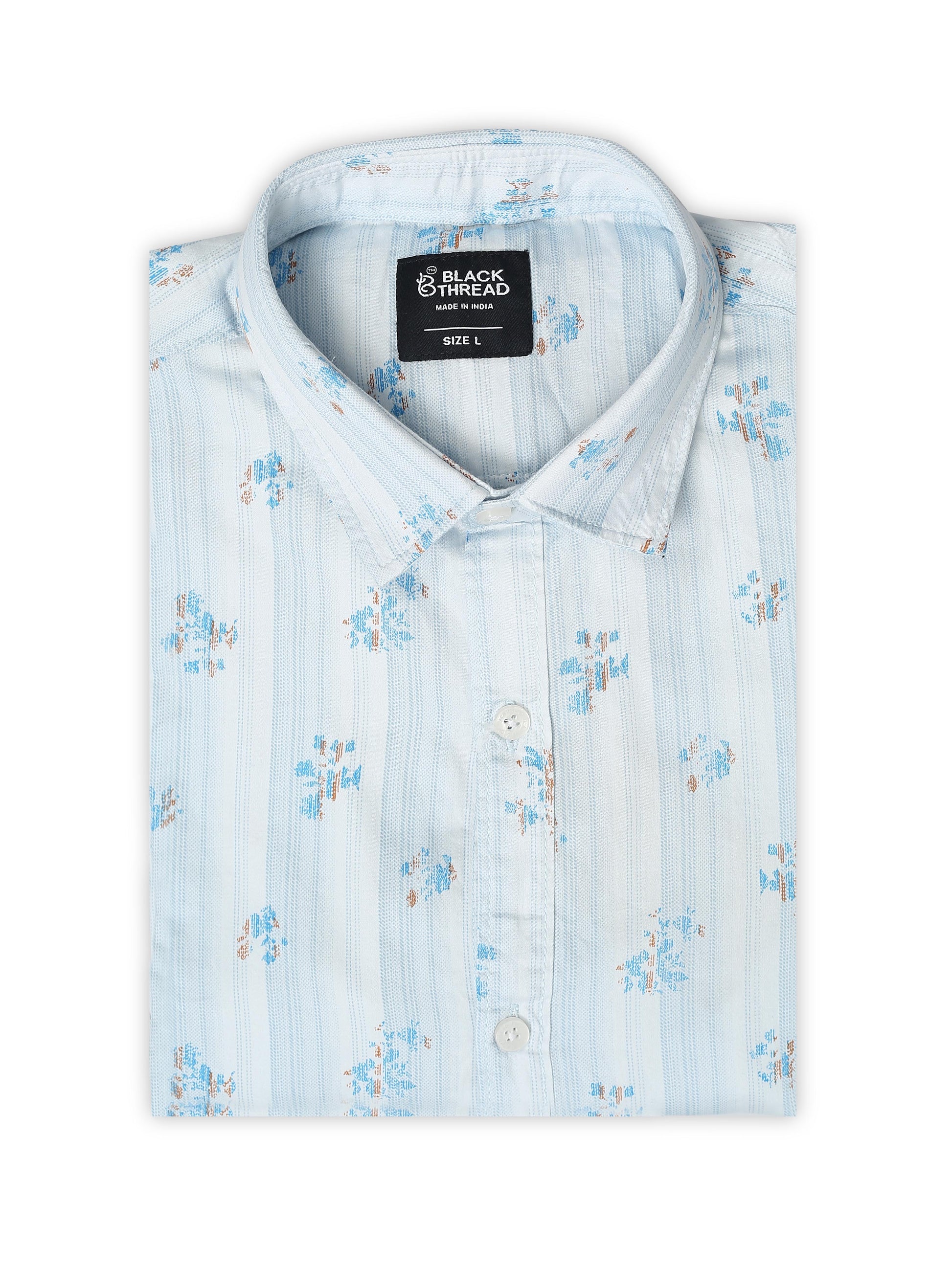 Bring coastal energy to your style with this Light Blue Palm Print Cotton Shirt by Black Thread. Made from premium breathable cotton, it features subtle palm motifs on a soothing blue base — ideal for laid-back weekends or vacation vibes. The slim-fit design adds structure while keeping things casual and easygoing.