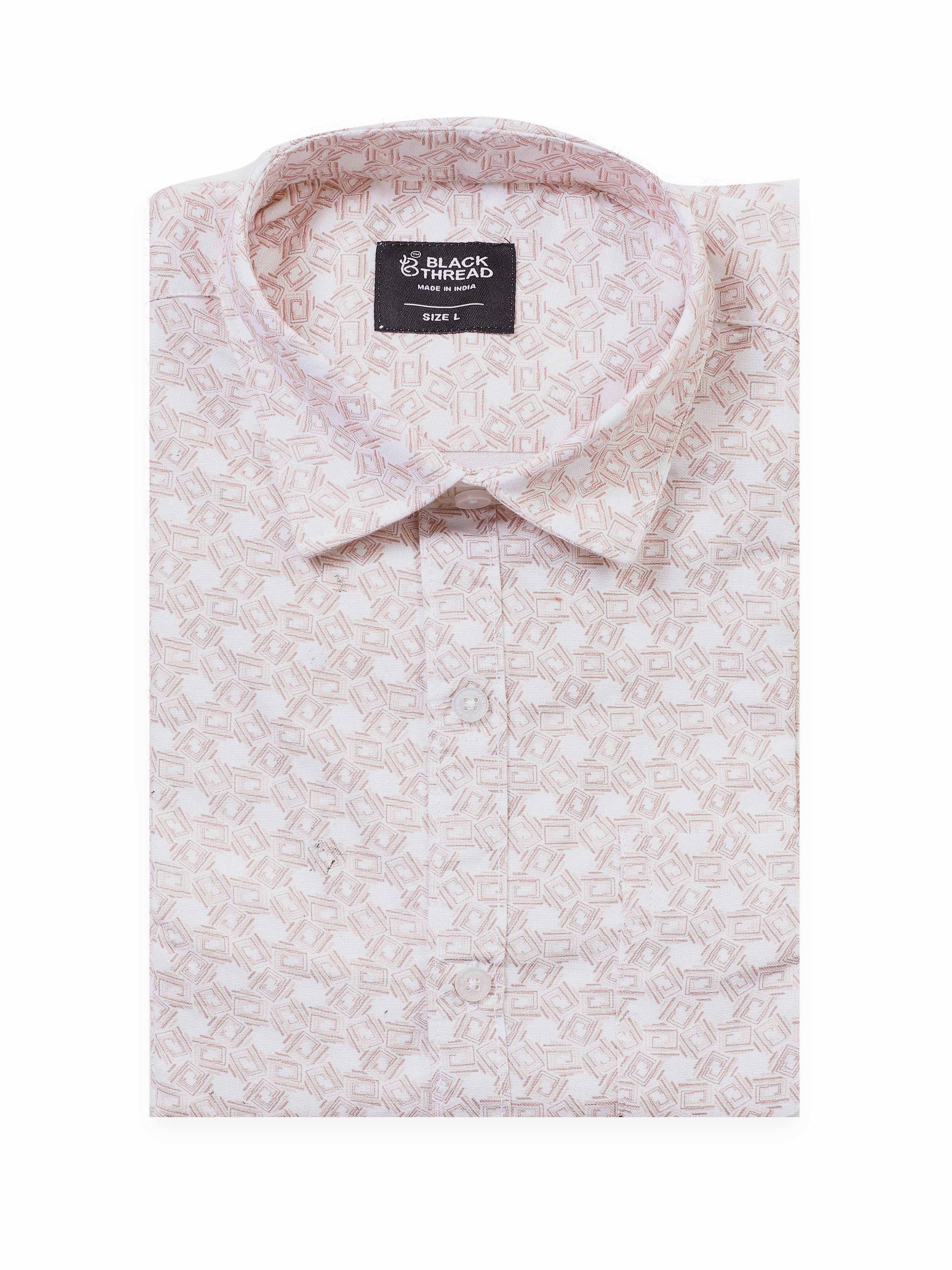 Soft and sophisticated, this Men’s Light Pink Printed Cotton Shirt by Black Thread is perfect for a refined yet casual look. Crafted from premium breathable cotton, it offers lightweight comfort while keeping your style polished. The pastel pink base is detailed with a delicate white all-over print, giving it a fresh and contemporary vibe. With slim-fit tailoring, a button-down front, and chest pocket, this shirt is an ideal choice for casual outings, office Fridays, or relaxed evening events.