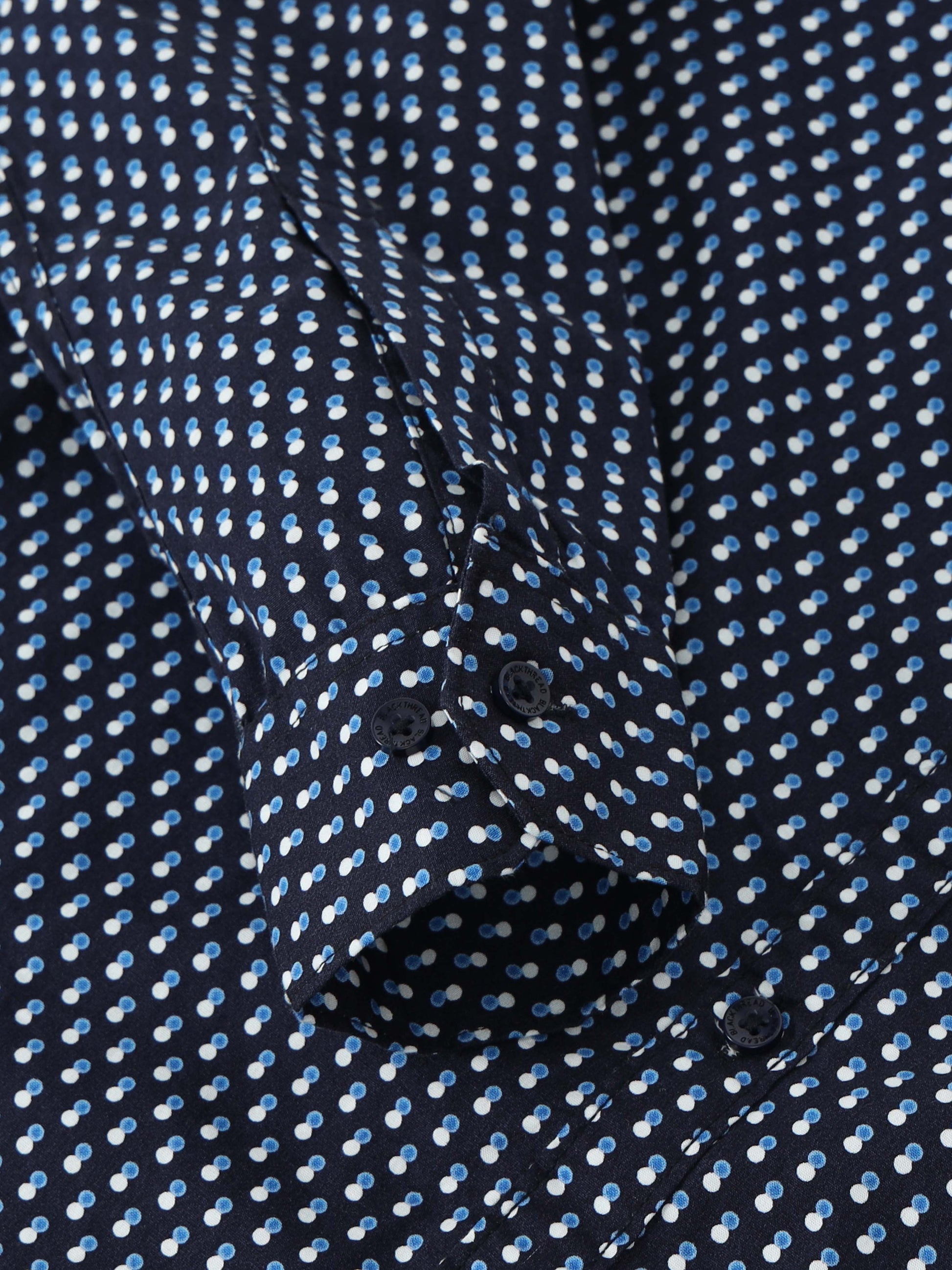 Sleek and versatile, this Men’s Navy Micro-Printed Cotton Shirt by Black Thread is a wardrobe essential that blends comfort with effortless style. Crafted from soft, breathable cotton, it ensures all-day ease while keeping your look sharp. The deep navy base is enhanced with minimal white micro-prints, giving it a refined yet contemporary edge. Finished with slim-fit tailoring, a button-down front, and contrast inner cuffs, this shirt is perfect for work, casual meet-ups, or evening outings.