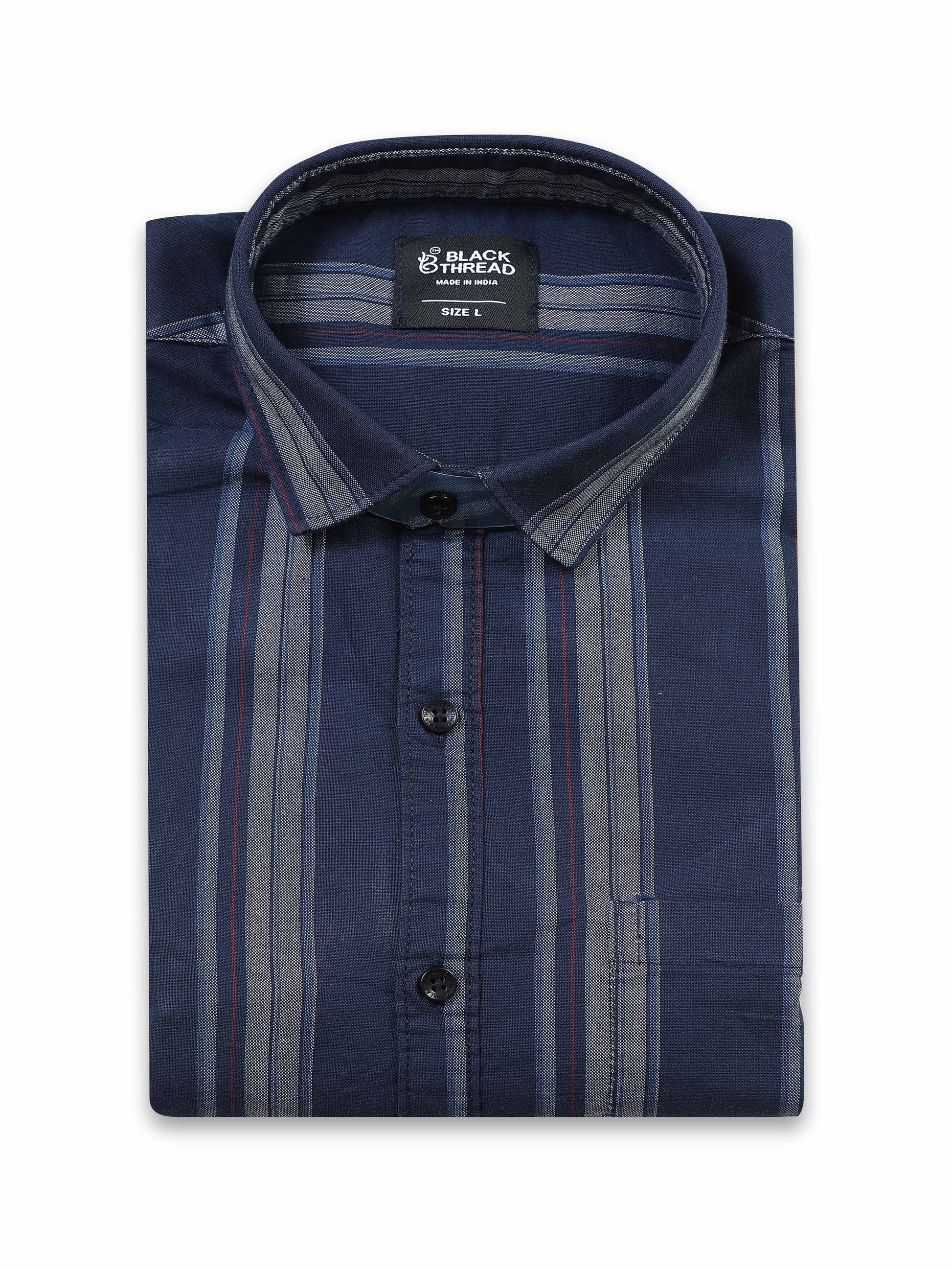 Effortlessly stylish, this Men’s Navy Blue Striped Cotton Shirt by Black Thread brings a touch of sophistication to everyday dressing. Made from premium breathable cotton, it ensures all-day comfort while keeping your look sharp. The navy base is highlighted with vertical grey stripes, creating a slimming and modern appeal. Designed with a slim-fit cut, button-down front, and chest pocket, this shirt transitions easily from office meetings to casual evenings. Pair it with chinos or denim for a versatile, polished look.