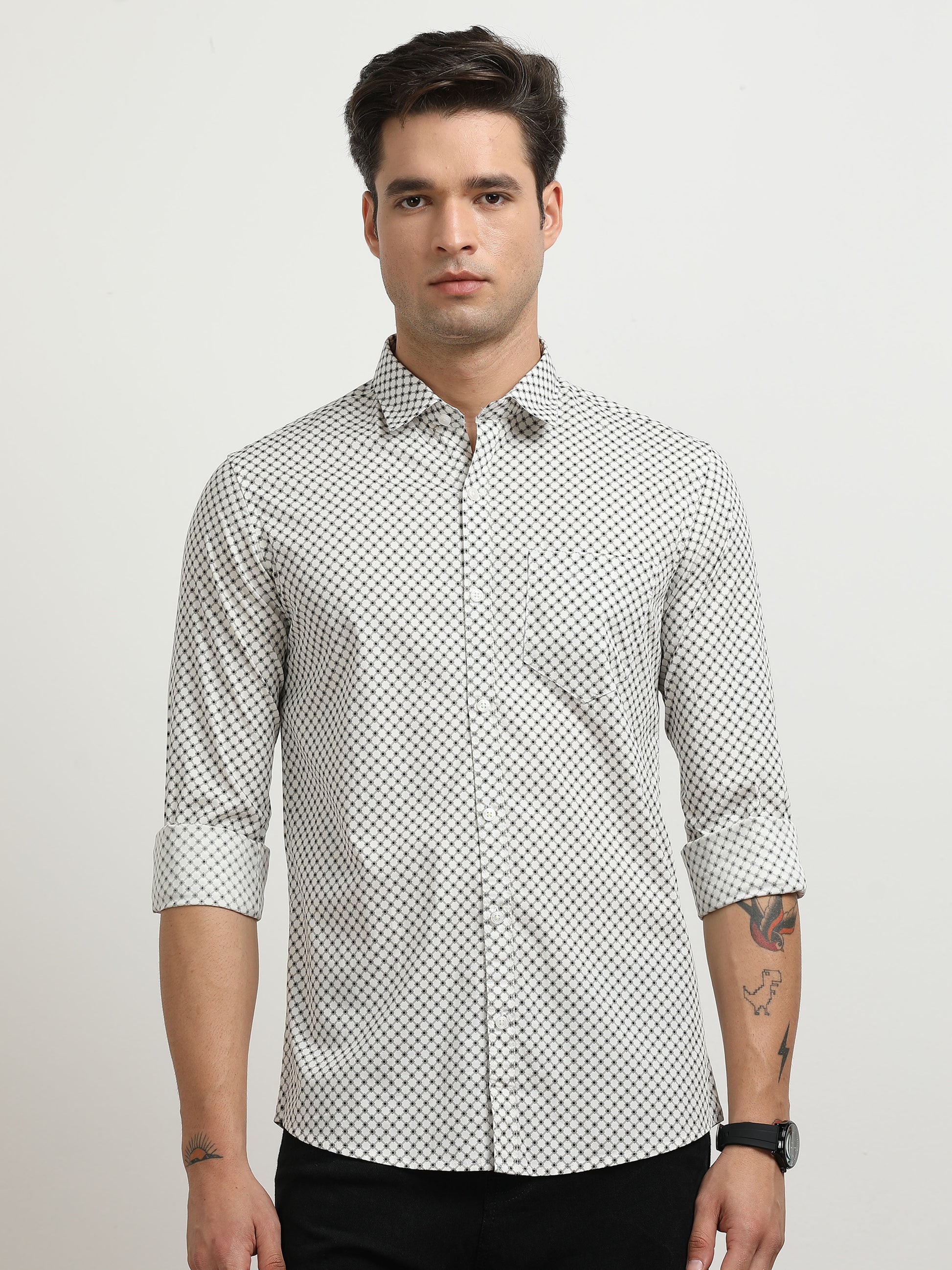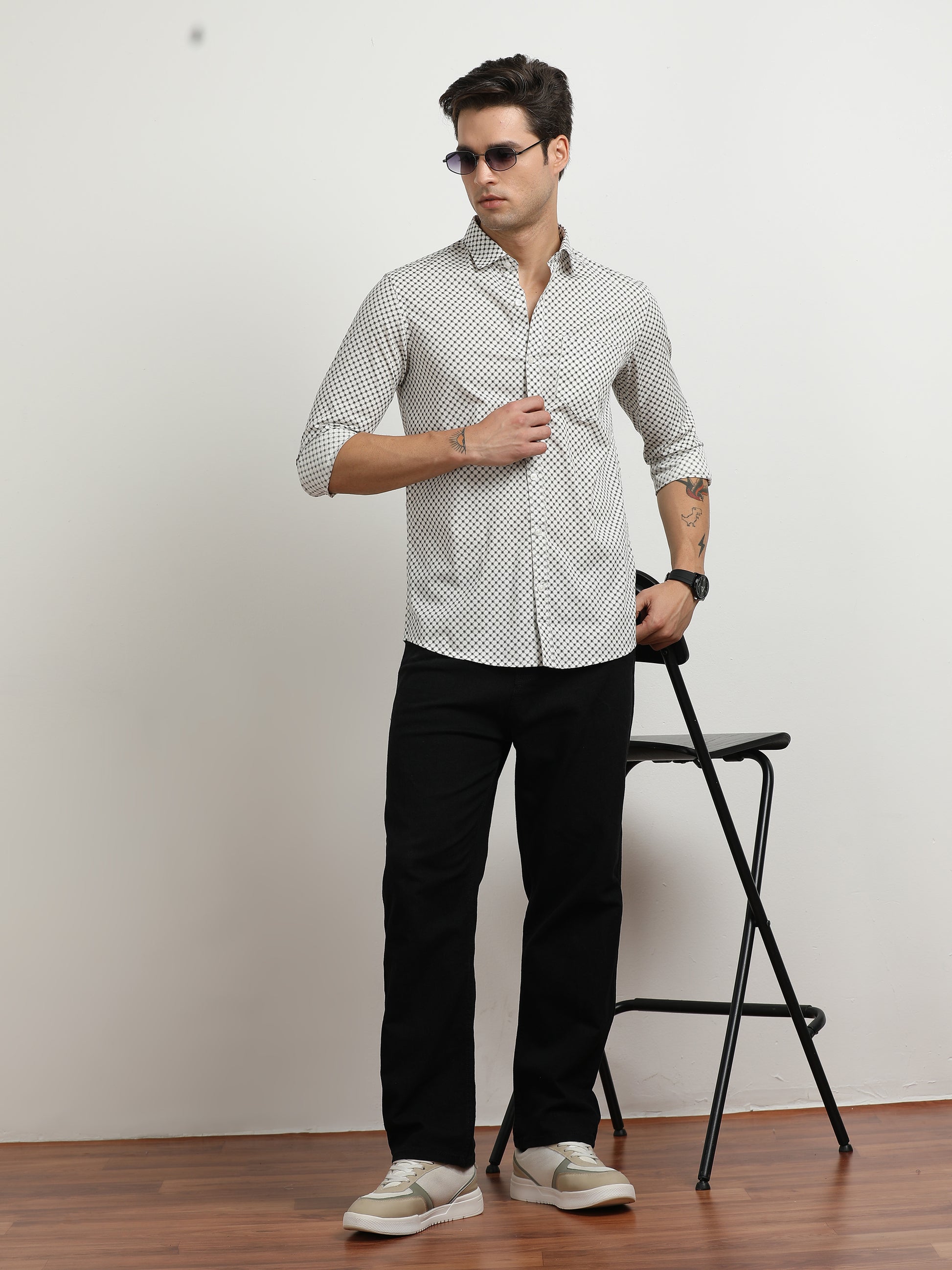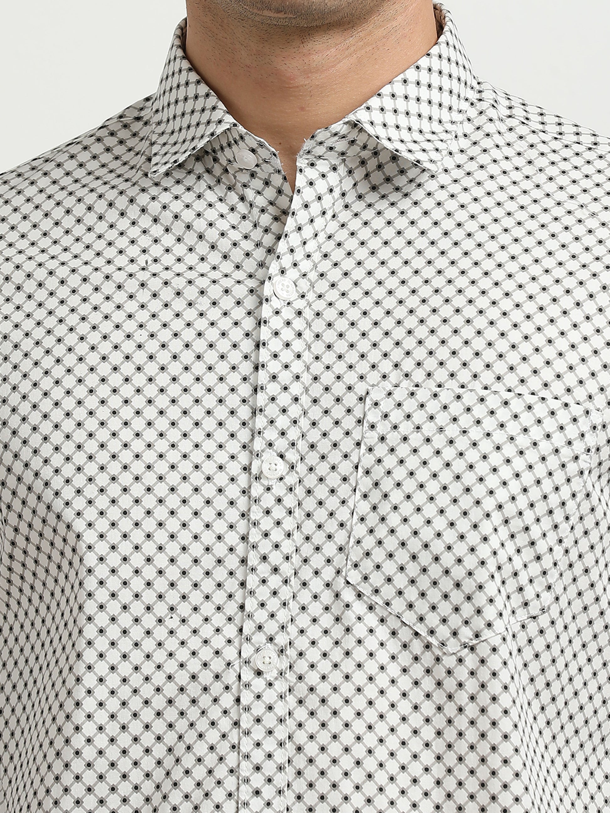 Men’s White & Black Geometric Printed Slim Fit Casual Shirt By Black Thread