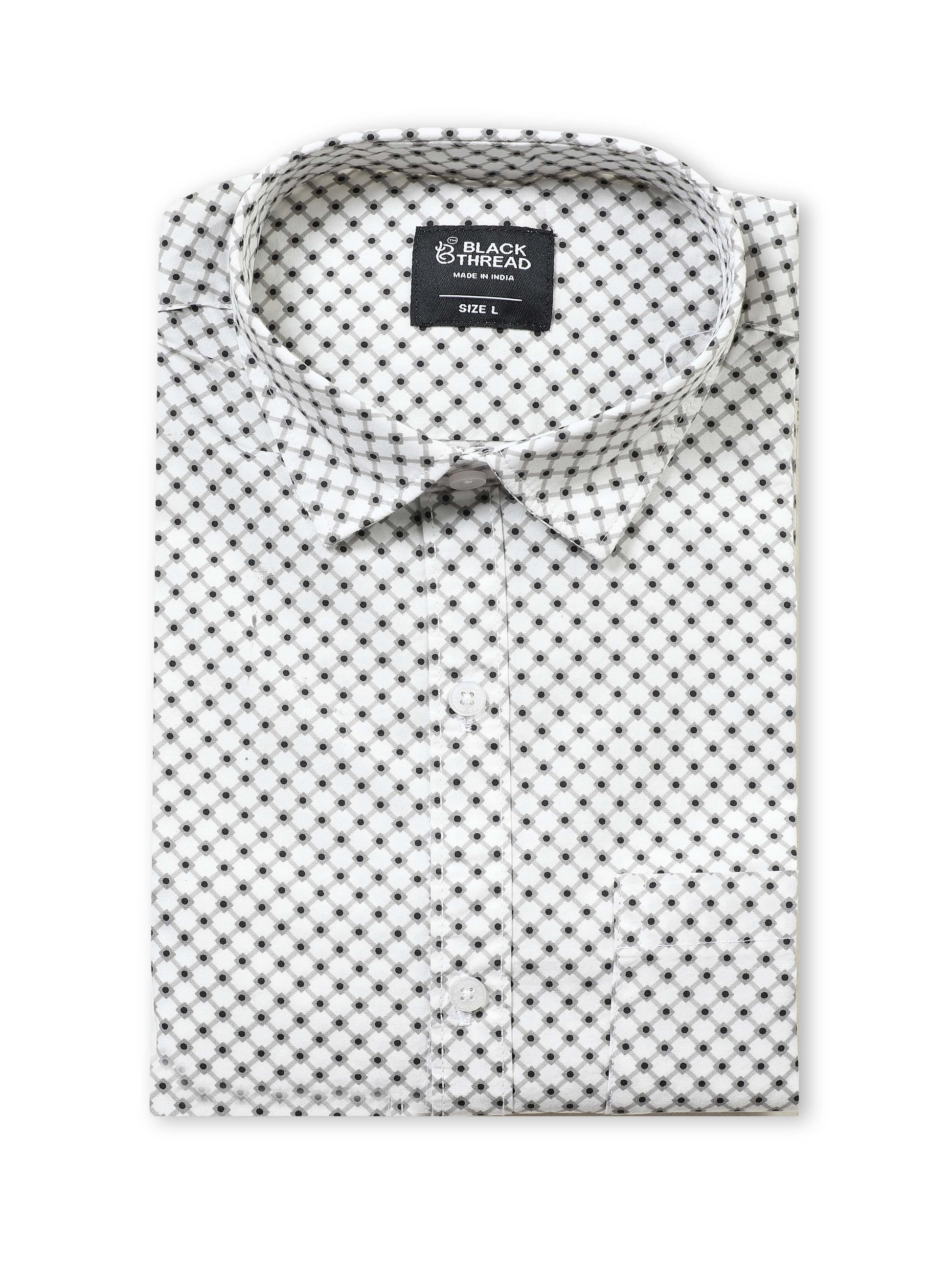 Minimal yet stylish, this Men’s White Printed Cotton Shirt by Black Thread is designed to add a touch of sophistication to your everyday look. Made from premium breathable cotton, it offers comfort while keeping your style sharp. The crisp white base is detailed with a neat black micro-print, giving it a modern and versatile appeal. With slim-fit tailoring, a chest pocket, and button-down front, this shirt transitions easily from office wear to casual outings.
