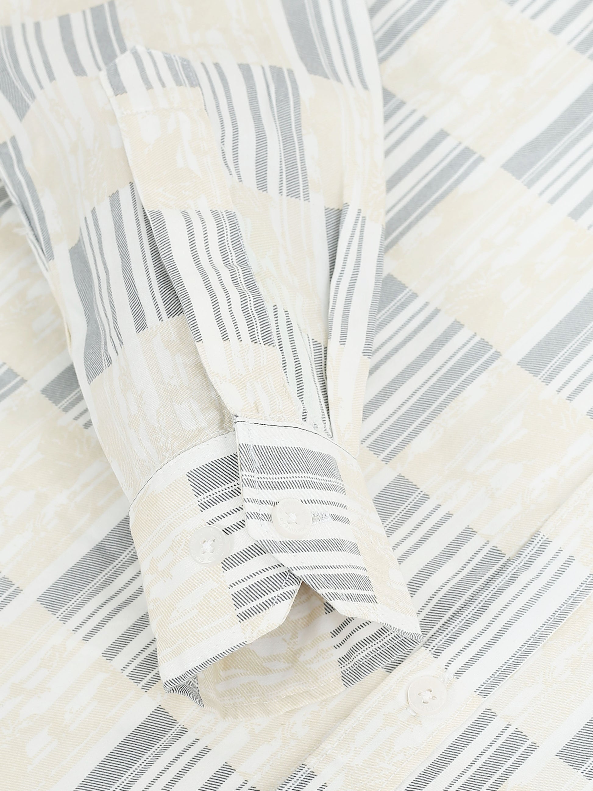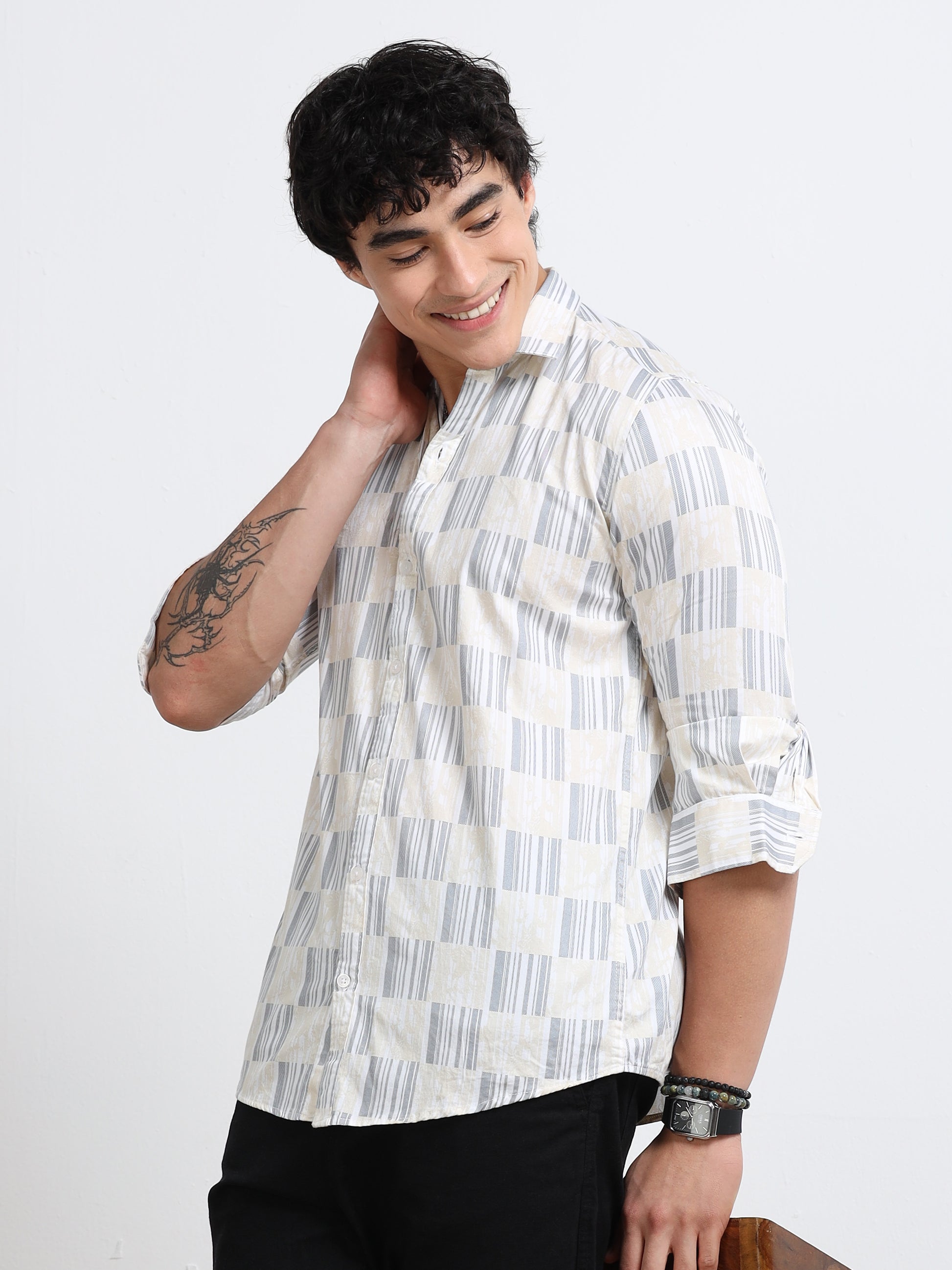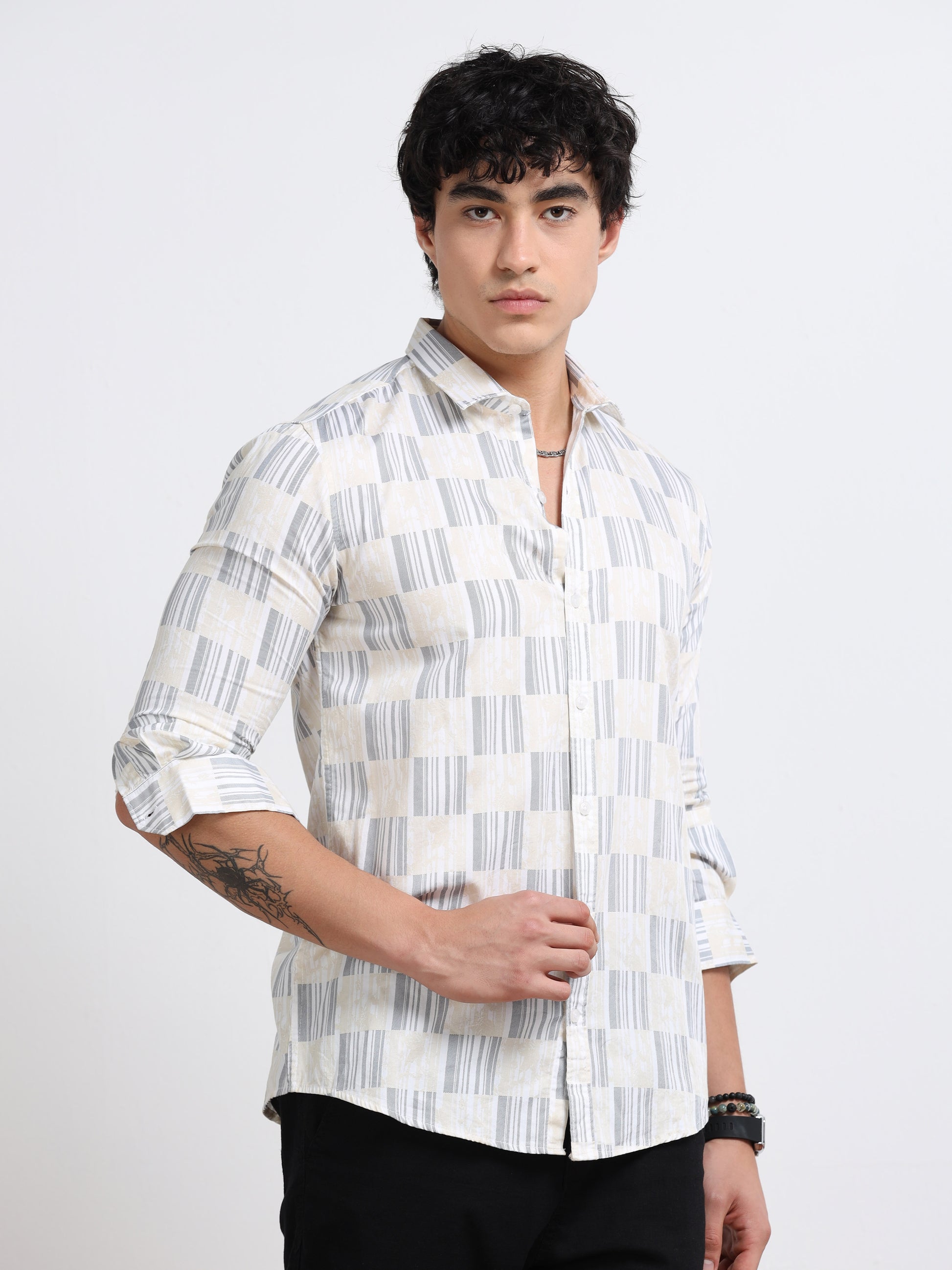 Clean, minimal, and modern — the Men’s White & Grey Block Printed Cotton Shirt by Black Thread is made for those who love subtle sophistication. Designed with a crisp white base and geometric grey block patterns, this shirt brings contemporary flair to everyday wear. The soft cotton fabric ensures all-day comfort, while the slim-fit cut keeps your look sleek and effortless. Perfect for day outings, smart-casual events, or weekend lunches.