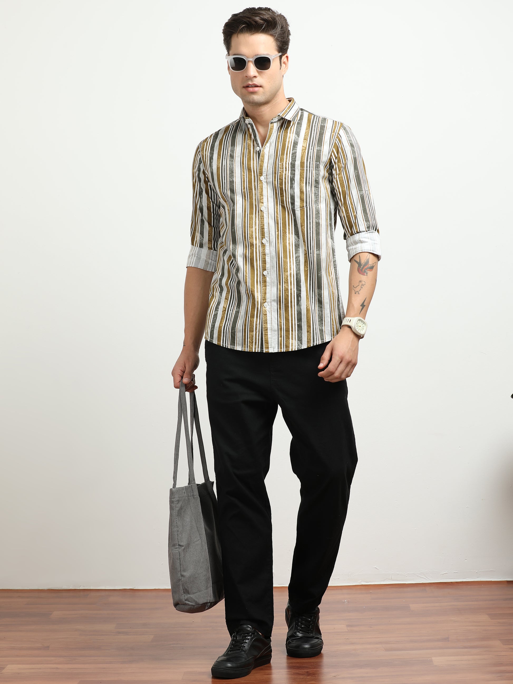 Men’s White & Mustard Striped Slim Fit Casual Shirt By Black Thread