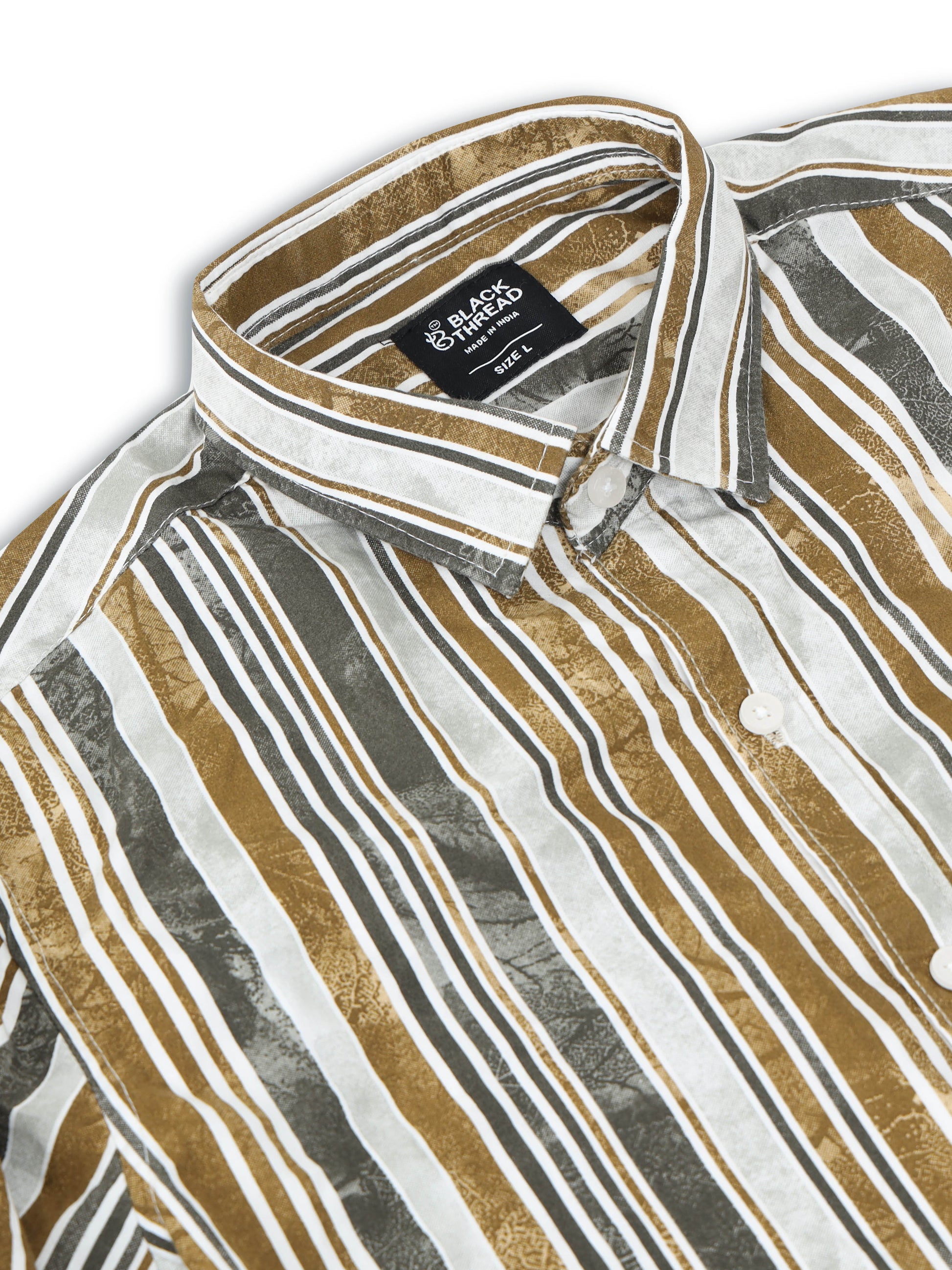 Fresh and modern, this Men’s White & Mustard Striped Cotton Shirt by Black Thread is a versatile piece that balances comfort with standout style. Crafted from premium breathable cotton, it’s lightweight and easy to wear through the day. The crisp white base is highlighted with vertical mustard and grey stripes, giving it a trendy yet refined appeal. Designed with a slim-fit cut, button-down front, and roll-up contrast inner cuffs, this shirt works equally well for casual outings and semi-formal occasions.
