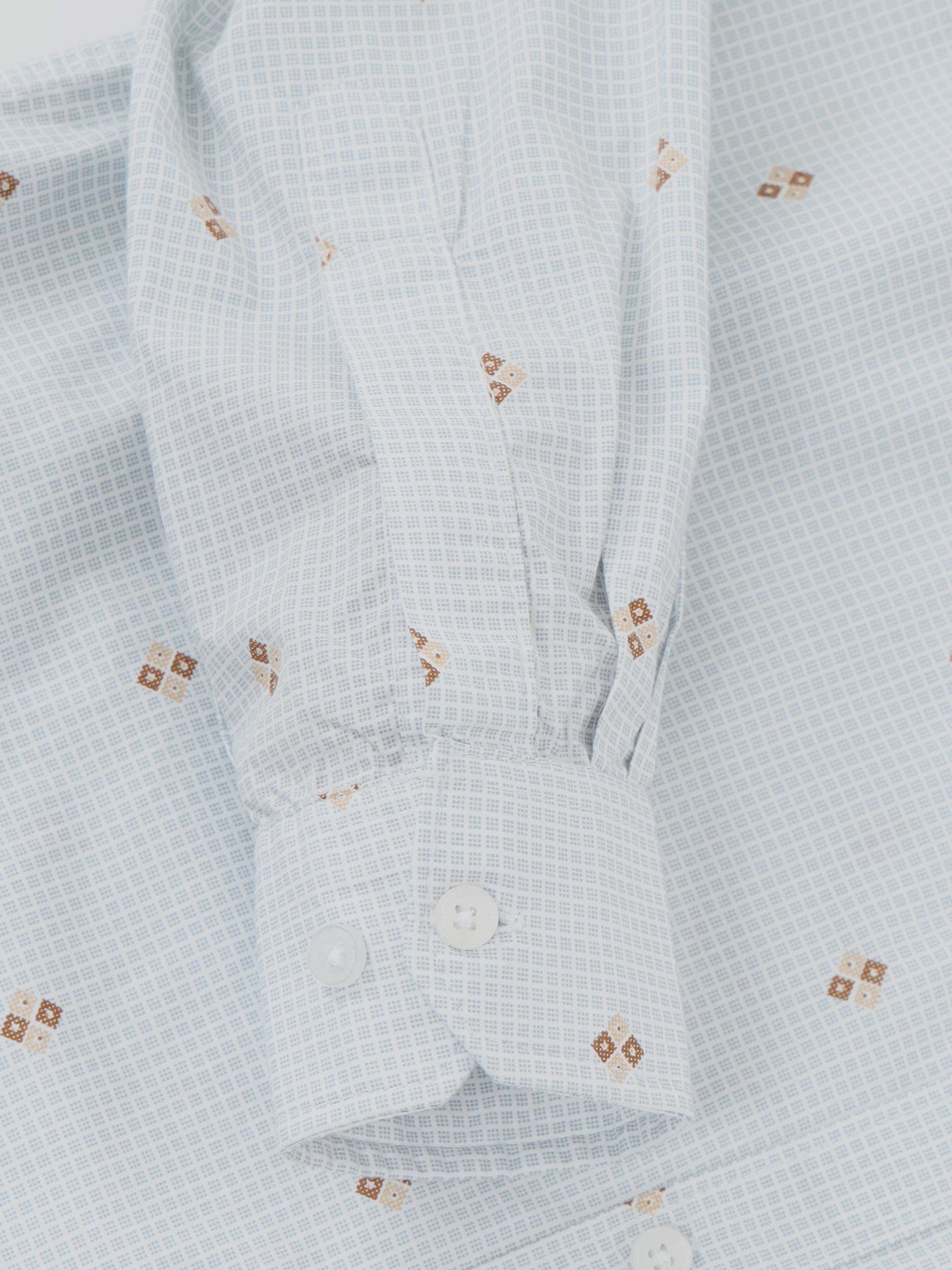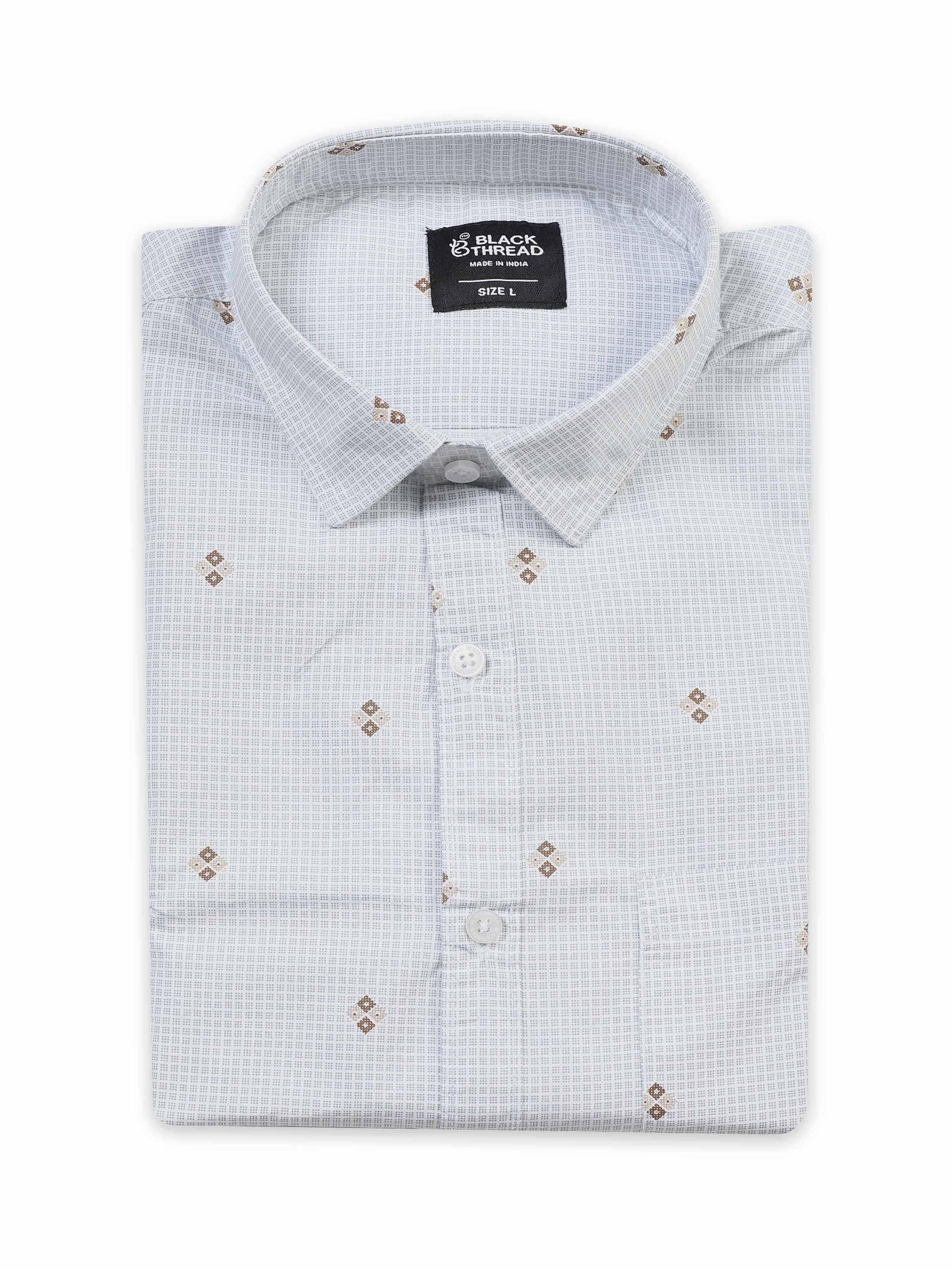 Fresh and trendy, this Men’s White Printed Cotton Shirt by Black Thread adds a playful edge to classic style. Made from premium breathable cotton, it ensures comfort while keeping you effortlessly sharp. The crisp white base is accentuated with subtle dotted stripes and small motif prints, giving it a unique yet versatile appeal. Designed with slim-fit tailoring, a chest pocket, and a button-down front, this shirt is perfect for casual wear, office looks, or weekend gatherings.